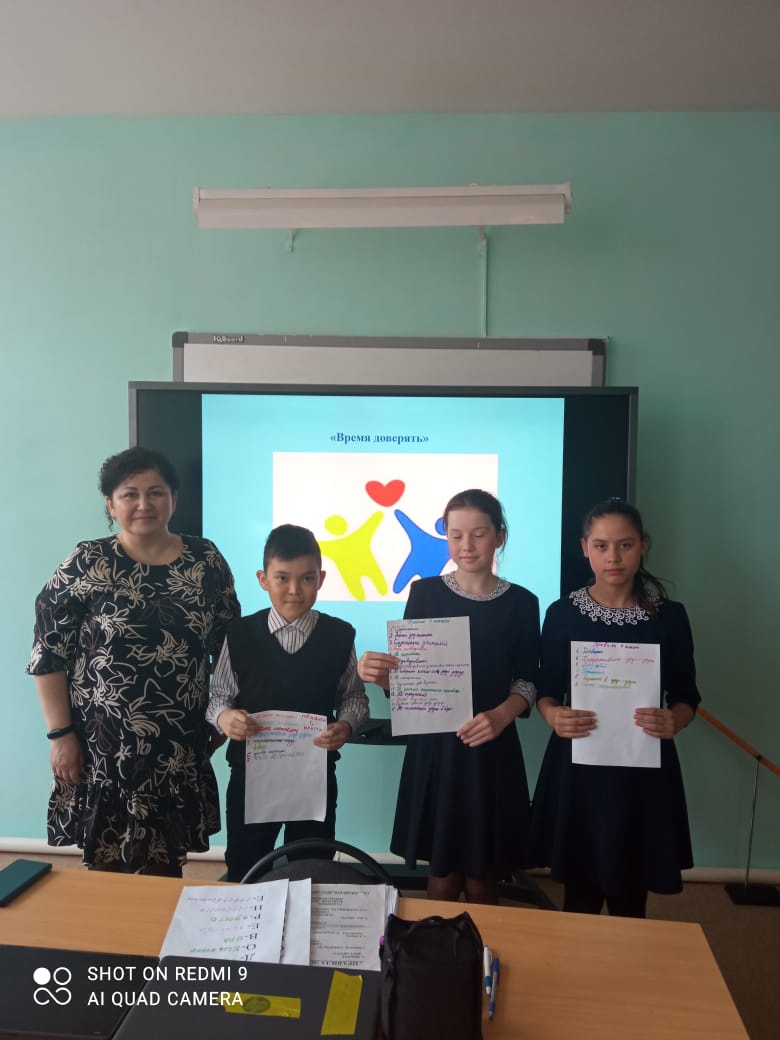 В это время психолог Службы семьи Якупова Гульшат Флюровна провела тренинговое занятие "Время доверять" с учащимися 5 - 7 классов с целью сплочения детского коллектива.