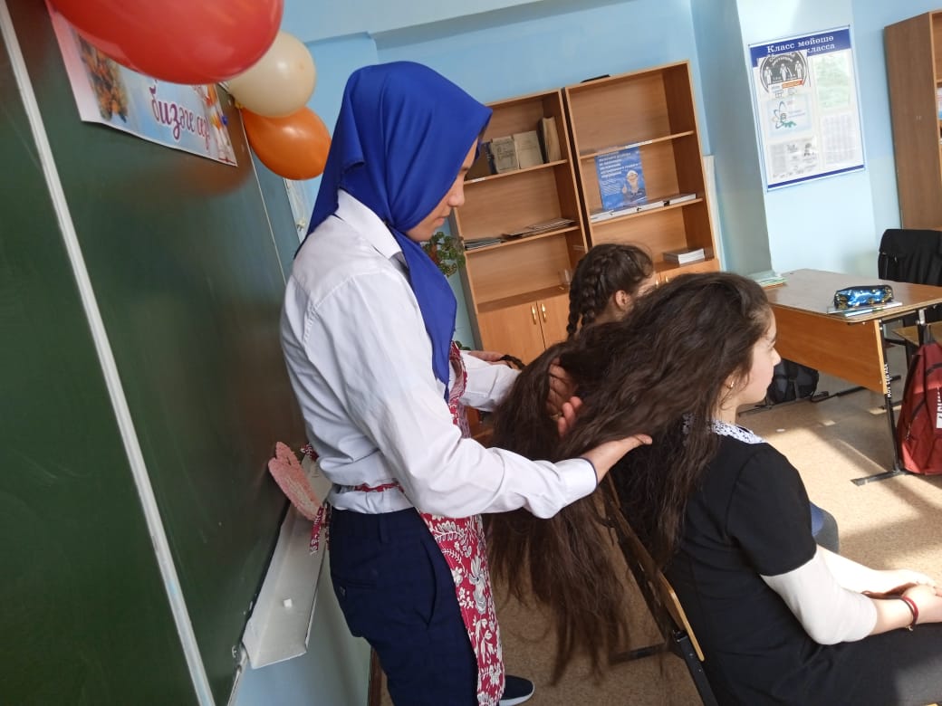 Учащиеся приняли участие в смотр-конкурсе «Варвара краса — длинная коса». Классный руководитель Макулова Р.Р. провела соревнования среди девочек «на самую длинную и красивую косу» и проверила мальчиков на умение плести косички, сказывая при этом много интересного про этот старинный русский праздник.